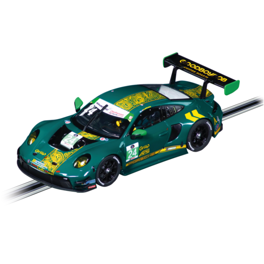 Wright Motorsports is geen onbekende in de racewereld. In het verleden hebben ze al overwinningen weten te boeken op de langeafstandsraces zoals de 12 uur van Sebring en 4 podiumfinishes tijdens de Rolex 24 uurs race van Daytone. Uitgerust in de teamkleuren groen en geel komt deze Porsche 911 GT3 R met nummer 24 naar jouw Carrera Digital 132 racebaan.