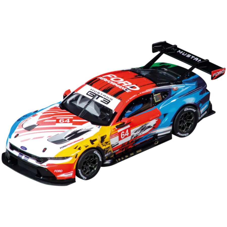 Deze vrolijk gekleurde Amerikaanse Ford Mustang GT3 is een bijzonder verschijning op jouw Carrera Digital 132 racebaan. Hij is niet alleen mooi om te zien maar heeft met al die PK’s ook echt wel wat te laten zien. Wordt hij echter de kampioen of niet, dat is de vraag!