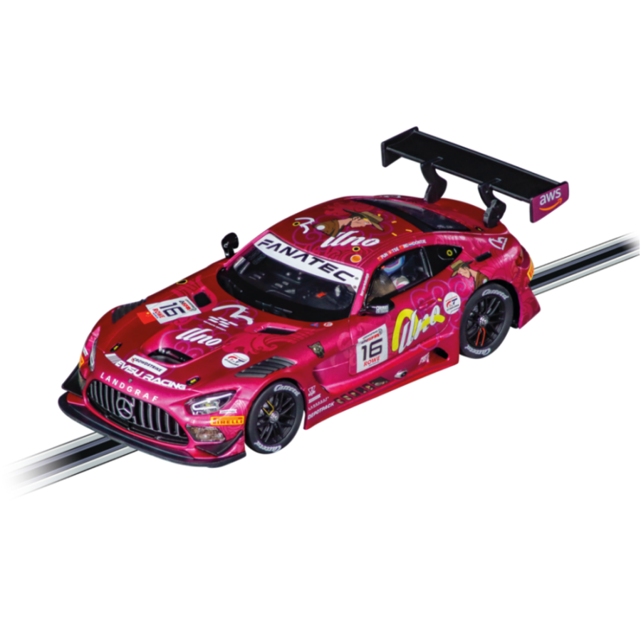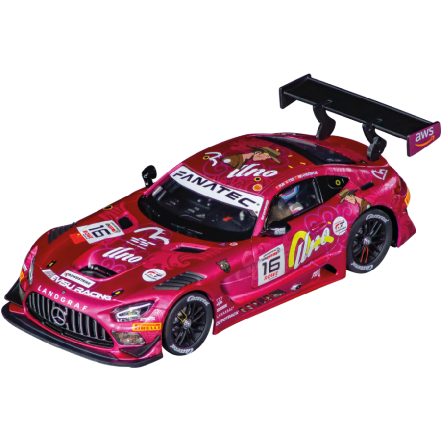 Het team Landgraf van Unoracing weet de aandacht te trekken tijdens de 24-uurs race van Spa met deze Mercedes-AMG GT3 Evo. Het is niet alleen de opvallende roze lak die de aandacht trekt, nee ook de auto zelf heeft voldoende PK’s onder de motorkap zitten om op te vallen. En nu is hij er ook voor op jouw Carrera Evolution racebaan. Aan de auto ligt het niet, het komt nu neer op jouw kwaliteiten als coureur!